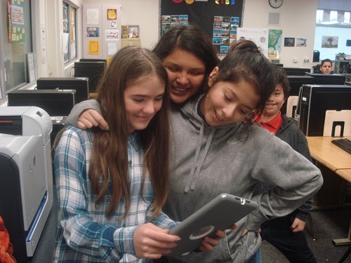 This is a group of Applied Tech students using an electronic device, which is an IPad.